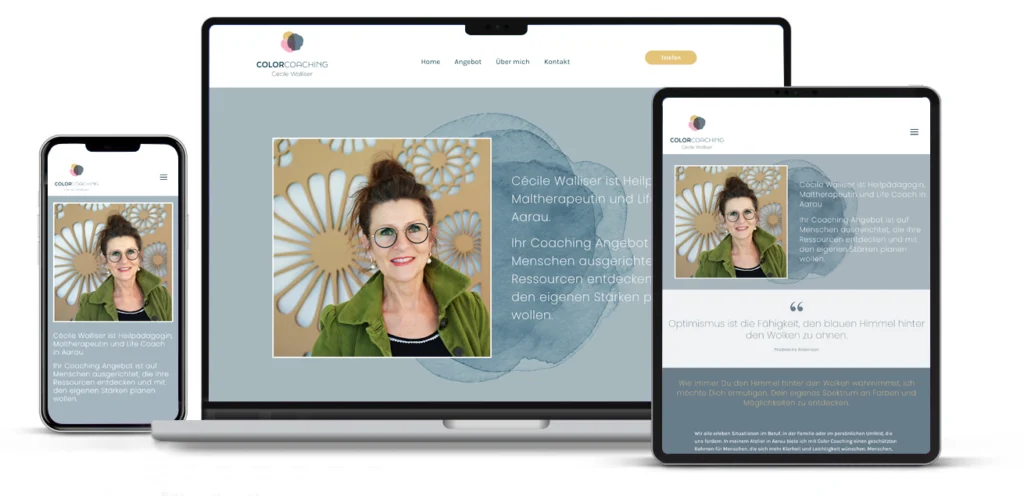 Eine Website, die Coaching erlebbar macht. Farbkleckse überschneiden sich wie im echten Leben – der kreative Funke springt über.